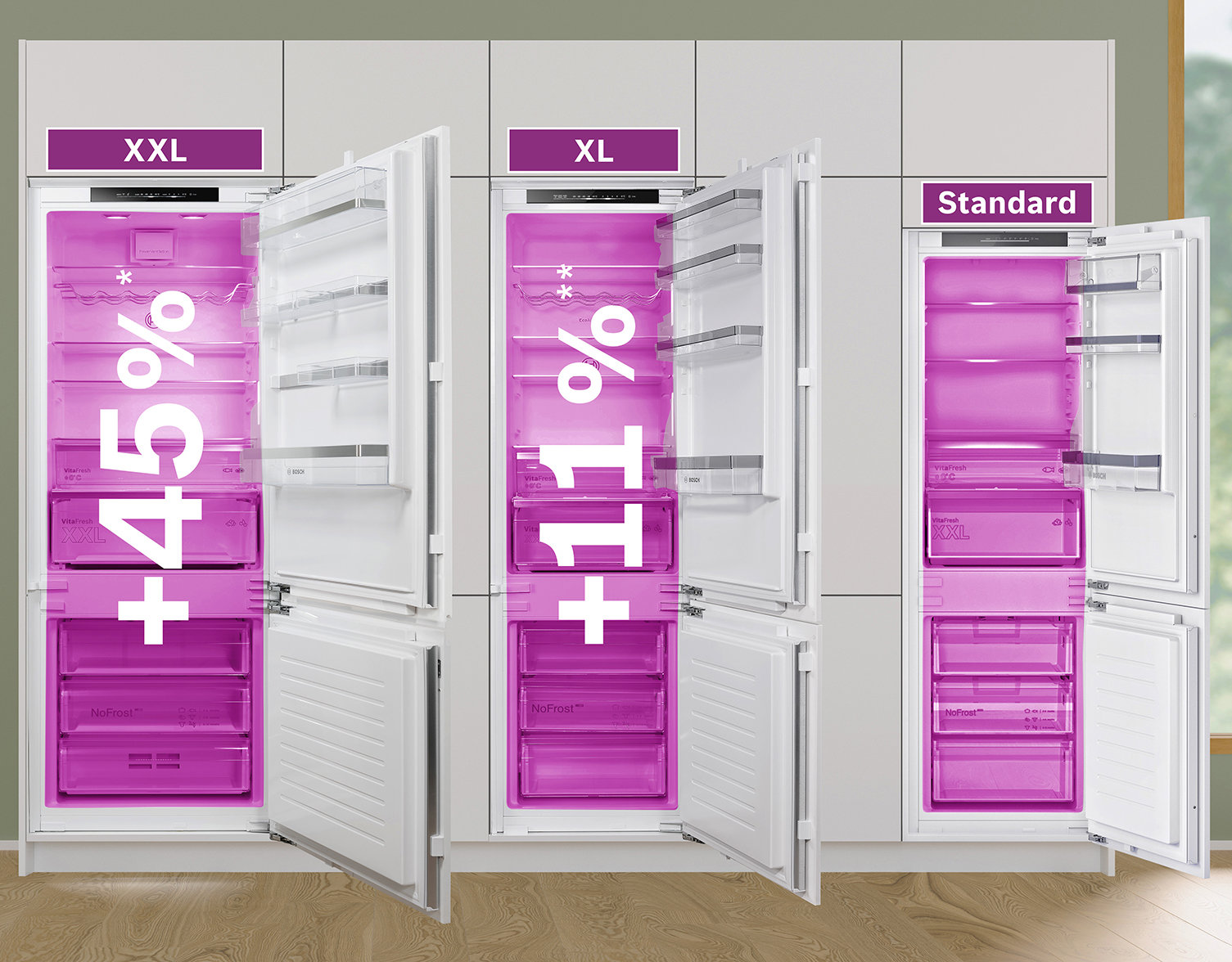 Ob Solo-Gerät oder integriert: XXL- und XL-Einbaugeräte schaffen Platz für großes Kühlgut wie Kochtöpfe, Wassermelonen und Großeinkäufe. Und das mit nur 16 cm mehr Höhe und 17 cm mehr Breite. Damit vergrößert sich der Stauraum des XXL-Kühl-Gefrierschranks um 45 %, verglichen mit dem Standardmodell. Die XL-Kühl-Gefrierkombination ist 16 cm höher als das Standardmodell und vergrößert damit den Innenraum um 11 %.